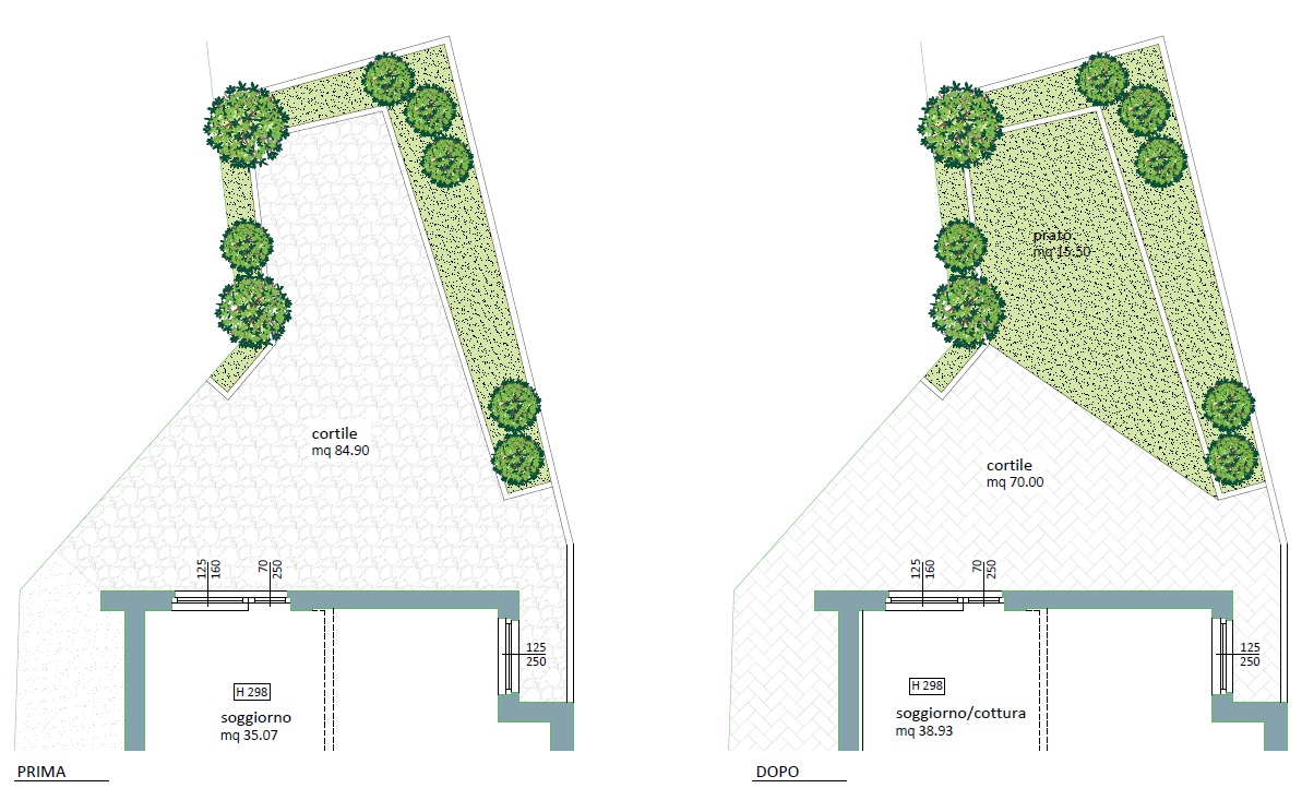 Nell'ambito della ristrutturazione di un appartamento a piano terra, è stato realizzato un piccolo giardino naturale, fruibile ed accogliente. Mantenendo le strisce di aiuole alberate e piantumabili, si è aperto uno spazio a prato seminato sostituendo la pavimentazione dissestata presente, creando così un'area naturale che si unisse alle piante e ai cespugli presenti nelle aiuole tutte a contorno. Queste ultime vengono utilizzate in parte per un piccolo orto che varia ogni anno secondo i desideri della famiglia che ci vive. La pavimentazione è stata realizzata con piastrelle effetto legno dal colore chiaro per dare luminosità e senso di freschezza anche durante le giornate soleggiate, andando ad intervenire con un'unica superficie anche nel corridoio laterale di servizio che corre lungo l'abitazione a ridosso del muro di confine. In questo punto si è voluta creare inoltre una canalina di scolo al piede della parete, dando inclinazione verso di essa a tutto il corridoio, per risolvere il problema di caduta acqua dal giardino soprastante soprattutto durante le piogge ed evitare ristagni e accumulo d'acqua verso l'abitazione.